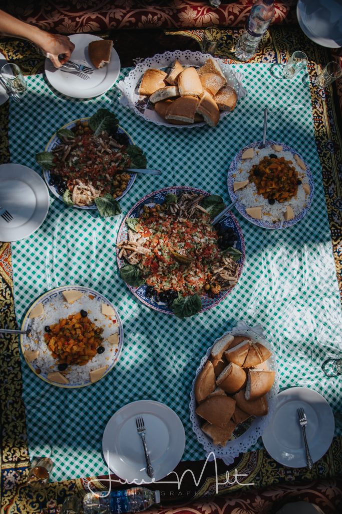 At lunch time, we stopped on the side of the road to have a bite. We expected sandwiches and a bottle of water but what we got was wayyyyy better. Mohammed, the driver and our cook set up some mats for us to sit down with a carpet in the middle. We were then served traditional mint tea followed by a salad and a hot meal with rice. And it was DELICIOUS.